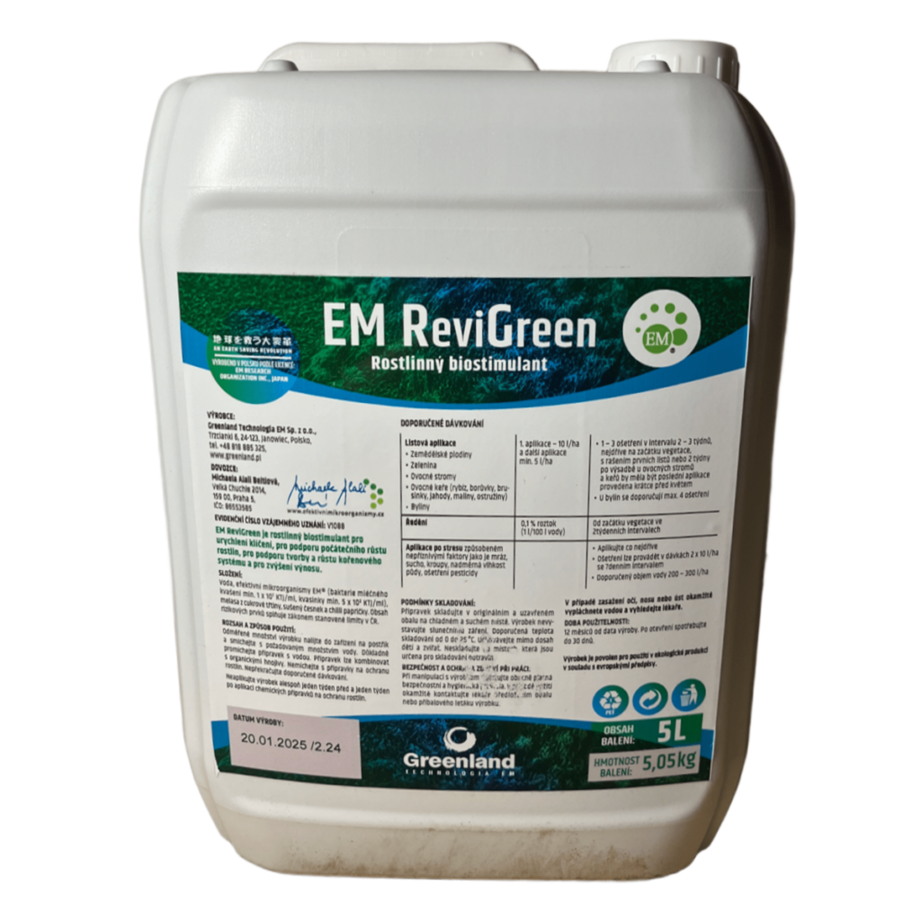 EM® ReviGreen je rostlinný biostimulant pro urychlení klíčení, pro podporu počátečního růstu rostlin, pro podporu tvorby a růstu kořenového systému a pro zvýšení výnosu.