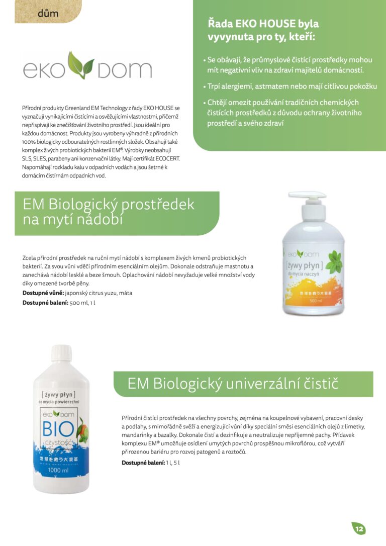 Několika stránkový katalog obsahuje produkty ze čtyř oblastí – domácnost, zdraví, krása a zahrada. U každého produktu najdete krátký popis, jeho složení a obsah dostupného balení. Objednávat produkty pak můžete pomocí objednávkových formulářů. Ceník je abecední seznam produktů s cenami v Kč a v EUR.